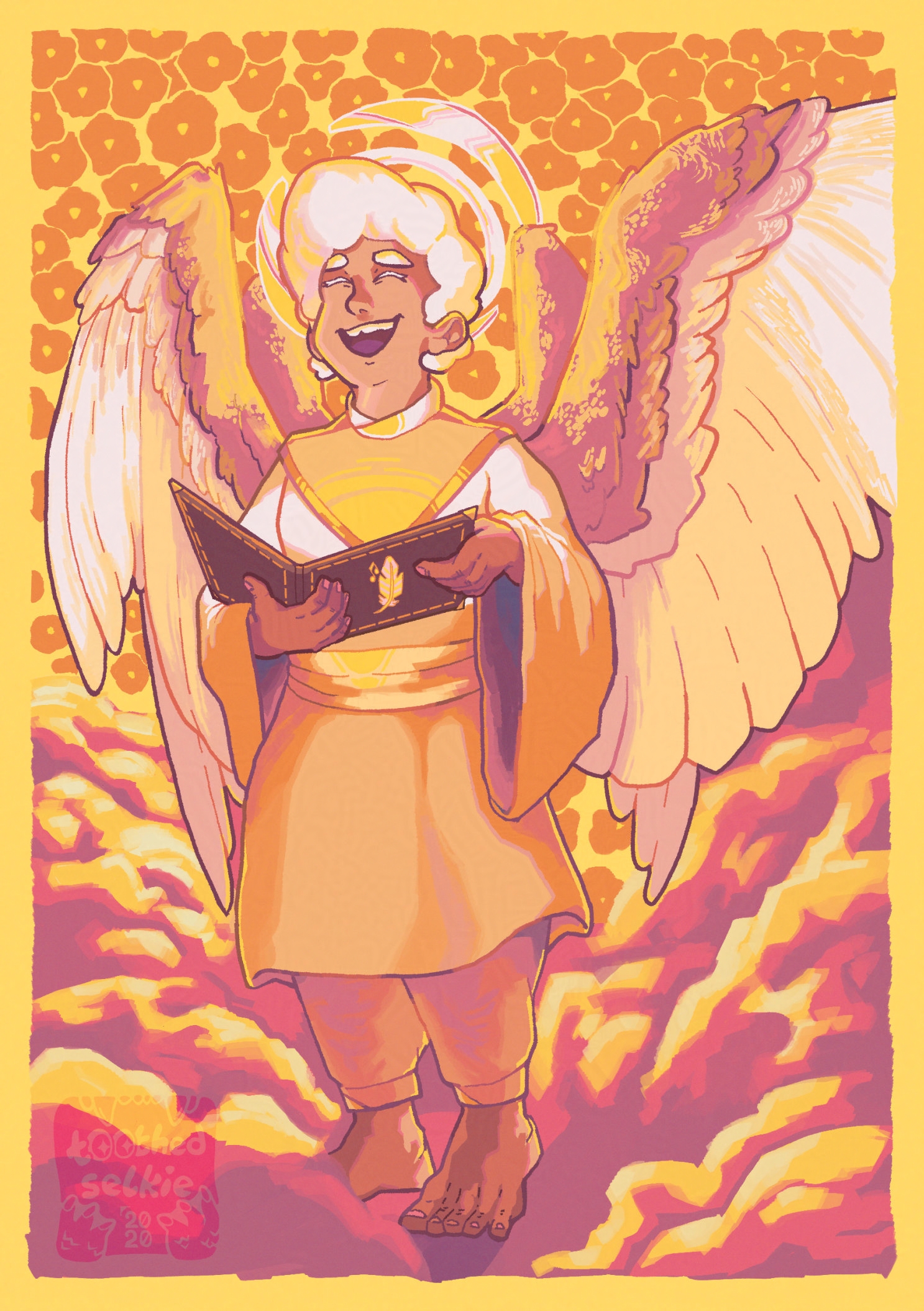 The main color palette for this illustration has golds, pinks, and whites, with an orange background. It features Aziraphale standing among the clouds, and joyfully singing as choir member in the heavenly choir. He is wearing white robes and holding a music folder in his hands. Behind his head is a shining, metallic halo. His two sets of wings are outstretched.