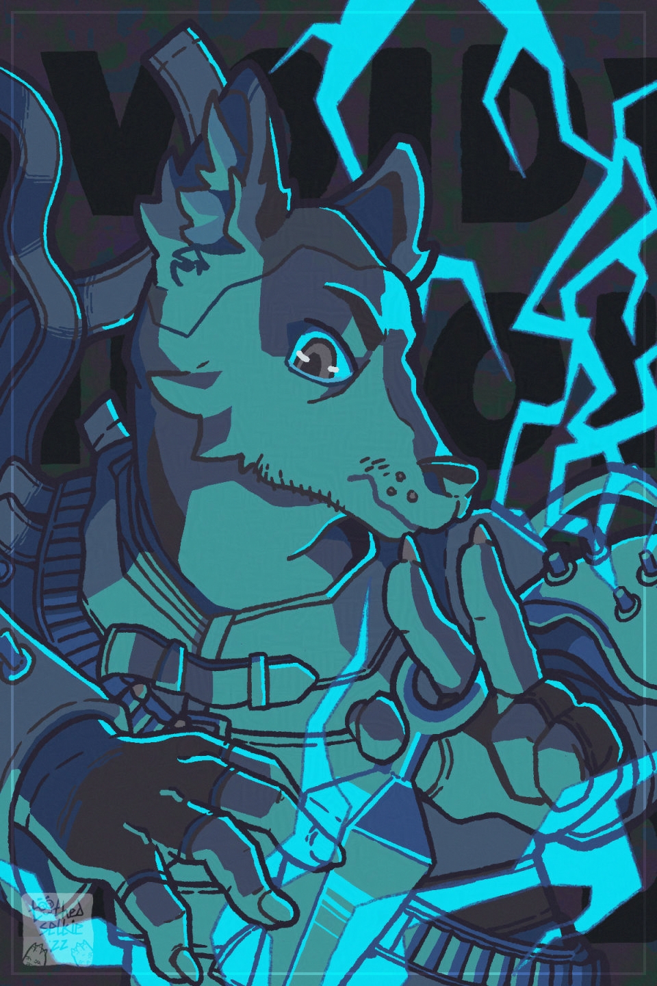 This illustration features Wight, Cannibal's character, who is a dog furry. The main color palette on this illustration has dark grays in the shadows, blue-green midtones, and bright blue highlights. It shows him from the chest-up, with limbs going slightly off-screen. He is wearing straitjacket-like tactical gear, with the loose belt-straps flying behind him.