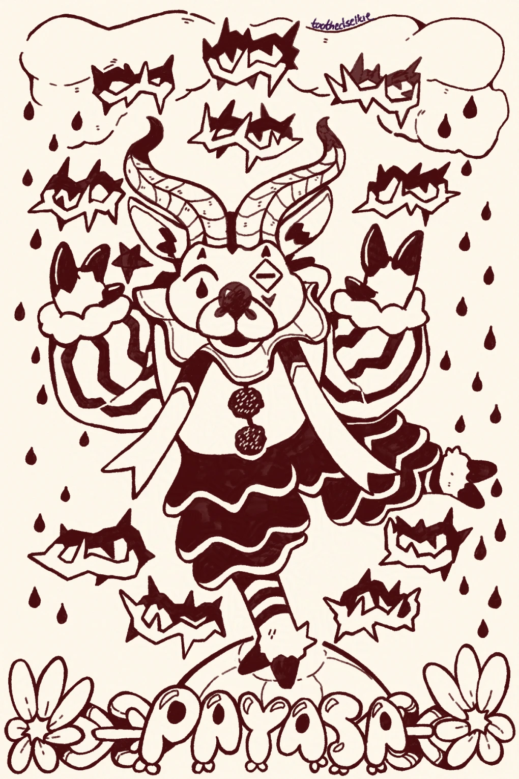 This dark-purple and white block print sketch shows a goat clown balancing on a large ball on one leg. The clown has both of their hands up while winking at the viewer. Around them are 10 crown of thorns. Above them are clouds raining down blood. At the bottom is the band's name, Payasa, in balloon letters. Behind the name is a line of heart-shaped chain links bookended by daisies.