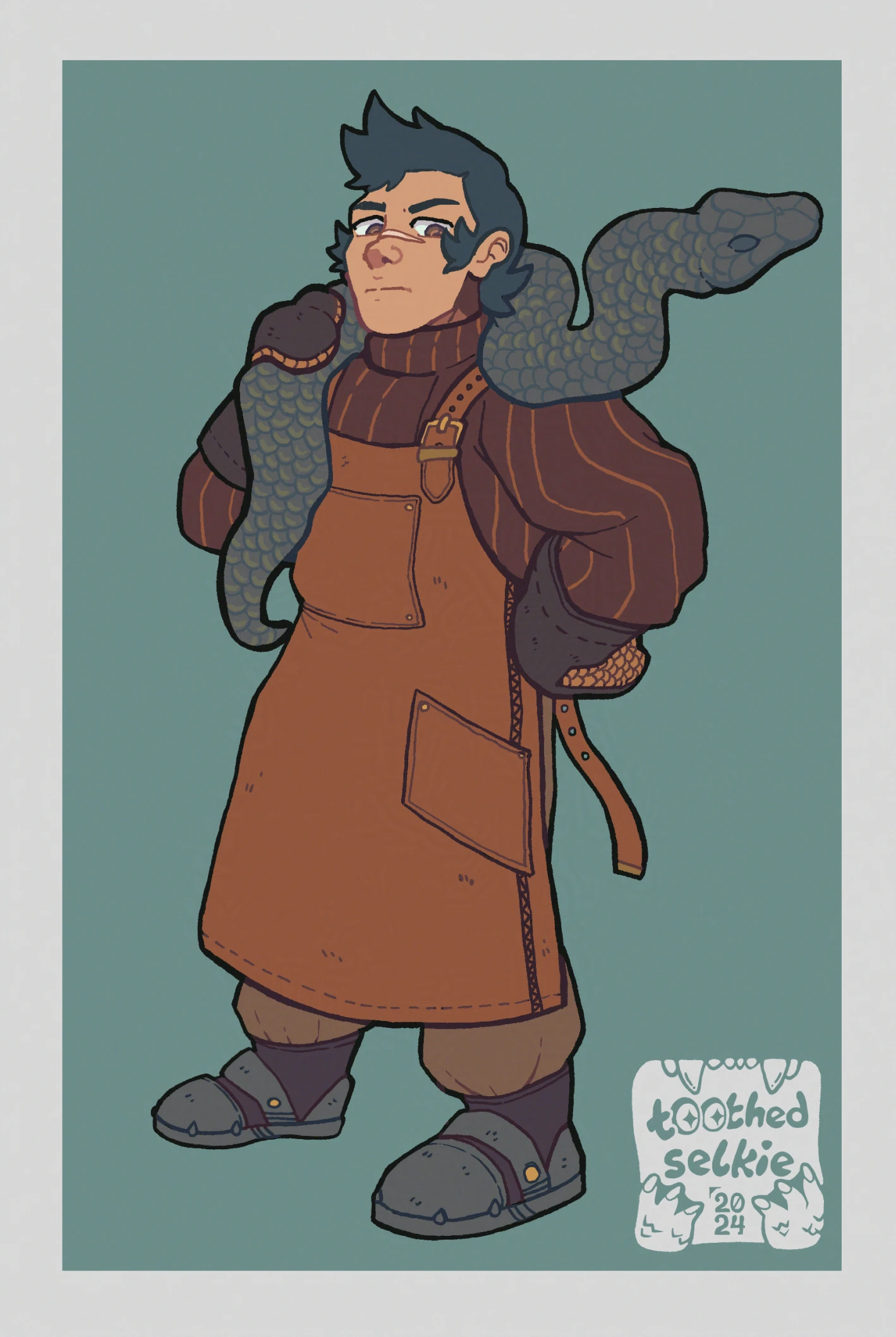 This character illustration features Jack looking disdainfully at the viewer. Jack is an Asian man who has blue-gray, spiky hair and brown eyes. He also has a large slash scar across his nose. He is dressed in a heavy, brown sweater with a leather apron. He has mitts on and is holding up a heavy, metallic snake that winds around his shoulders. For protection, he also wears metal-reinforced boots.