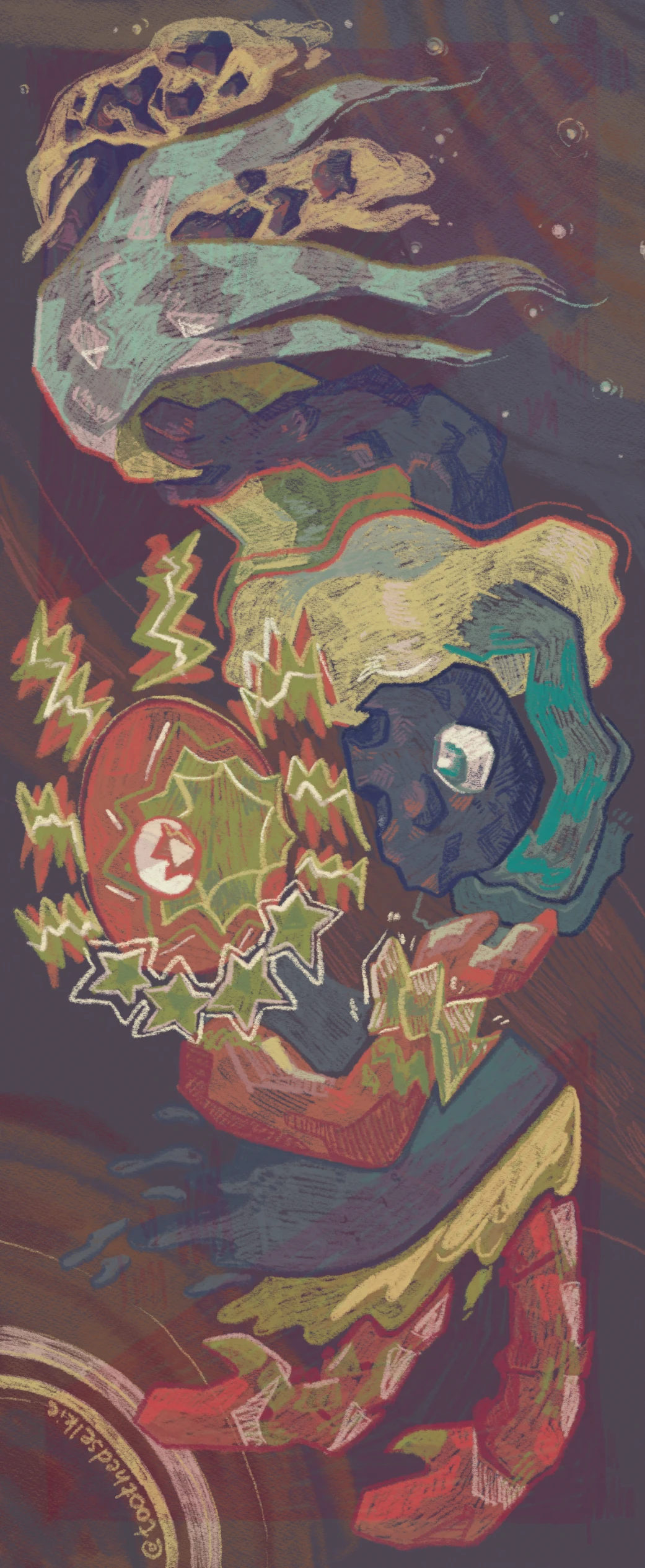 This illustration shows two beings themed around the sun and moon floating around each other. The sun being is crystal-like, colored in red-orange and greens. They wear a gray-blue dress that matches the colors of the moon being. Their dress is slightly formless, with the bottom edge flying off into the distance. They're reaching towards the moon being. On the other hand, the moon being is colored in blue-grays and blues, and is rock-like. They wear a green dress that echoes the sun being's colors, along with a ribbon-like striped flag at the bottom. The background is a slightly desaturated slice of a galaxy with stars and planetary rings.