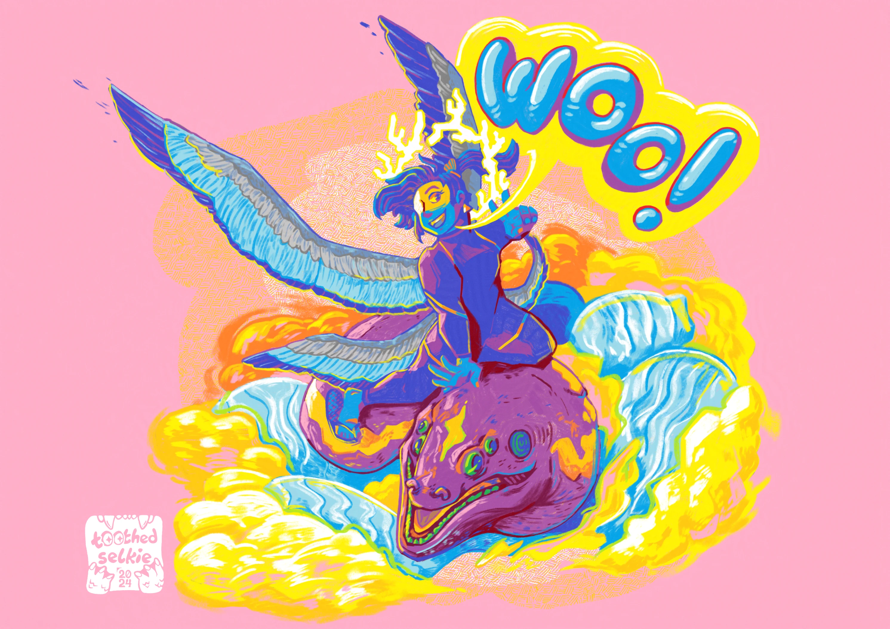 This character illustration shows an angel named Tsaaiel surfing on a large eel. The color palette is based on MS Paint's palette, with saturated purple and blues on Tsaaiel and her eel, and oranges and yellows in the background to contrast. Tsaaiel throws up a peace sign and shouts "WOO!". Being an angel, she has two pairs of wings fully extended in the wind. She also has dark, long hair tied back in a ponytail and a coral-shaped, white halo behind her head. She wears a plain wetsuit and flip-flops. The eel she's riding on is a purple moray eel with multiple pairs of eyes. They have yellow lateral stripes and is grinning as they cut through the waves. The background is composed of waves and ocean spray.